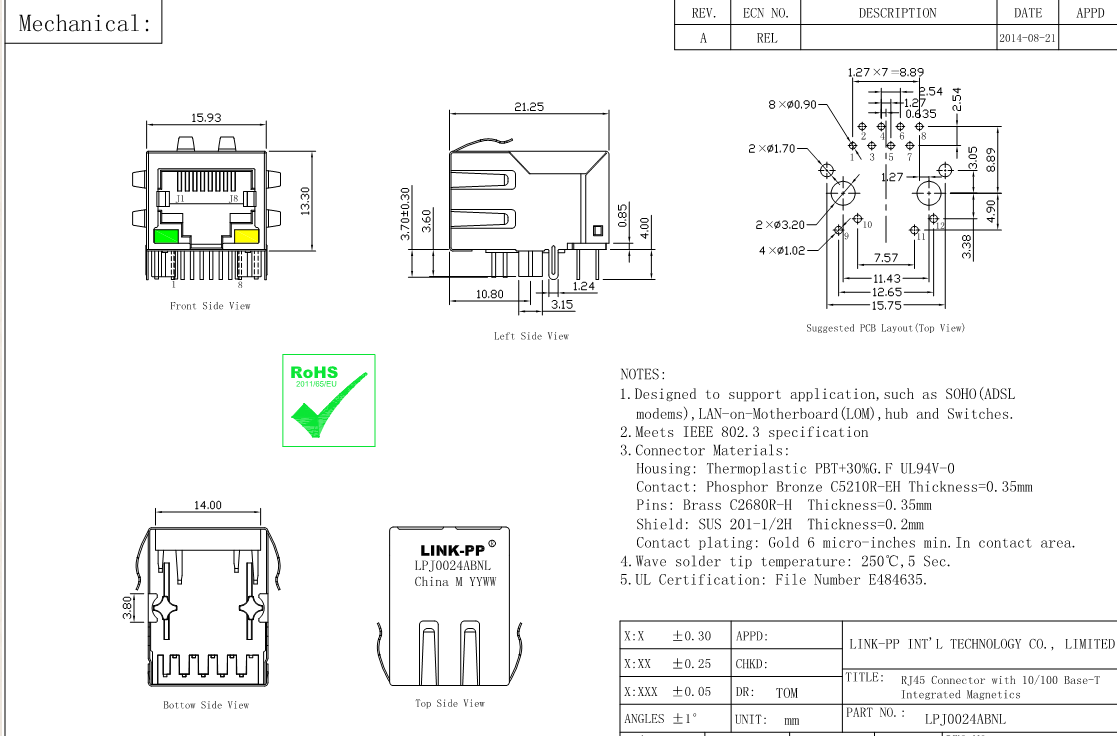 LPJ0024ABNL Single Port 10/100 Base-T RJ45 Female Connector Socket Connection J0024D21B Images |